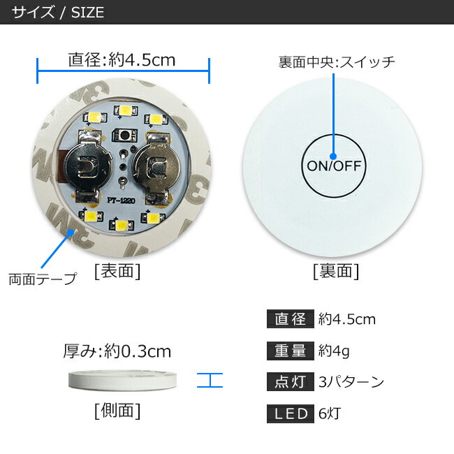 > 商品仕様 品名 光るボトルコースター 白色点灯 4.5cm 6LED(cst-bt-45) サイズ(約) 直径4.5cm×厚み0.3cm 重量(約) 4g 素材 EVA発泡樹脂、プラスチック 本体カラー ホワイト LED球数 6灯 LEDカラー ホワイト 電源 CR1220電池2個内蔵 点灯パターン 3種類(早い点滅/ゆっくり点滅/常時点灯) 裏面スイッチ個所を押すごとに切り替わります。